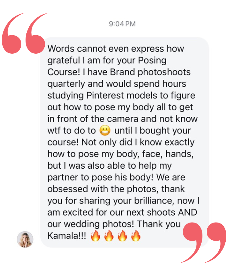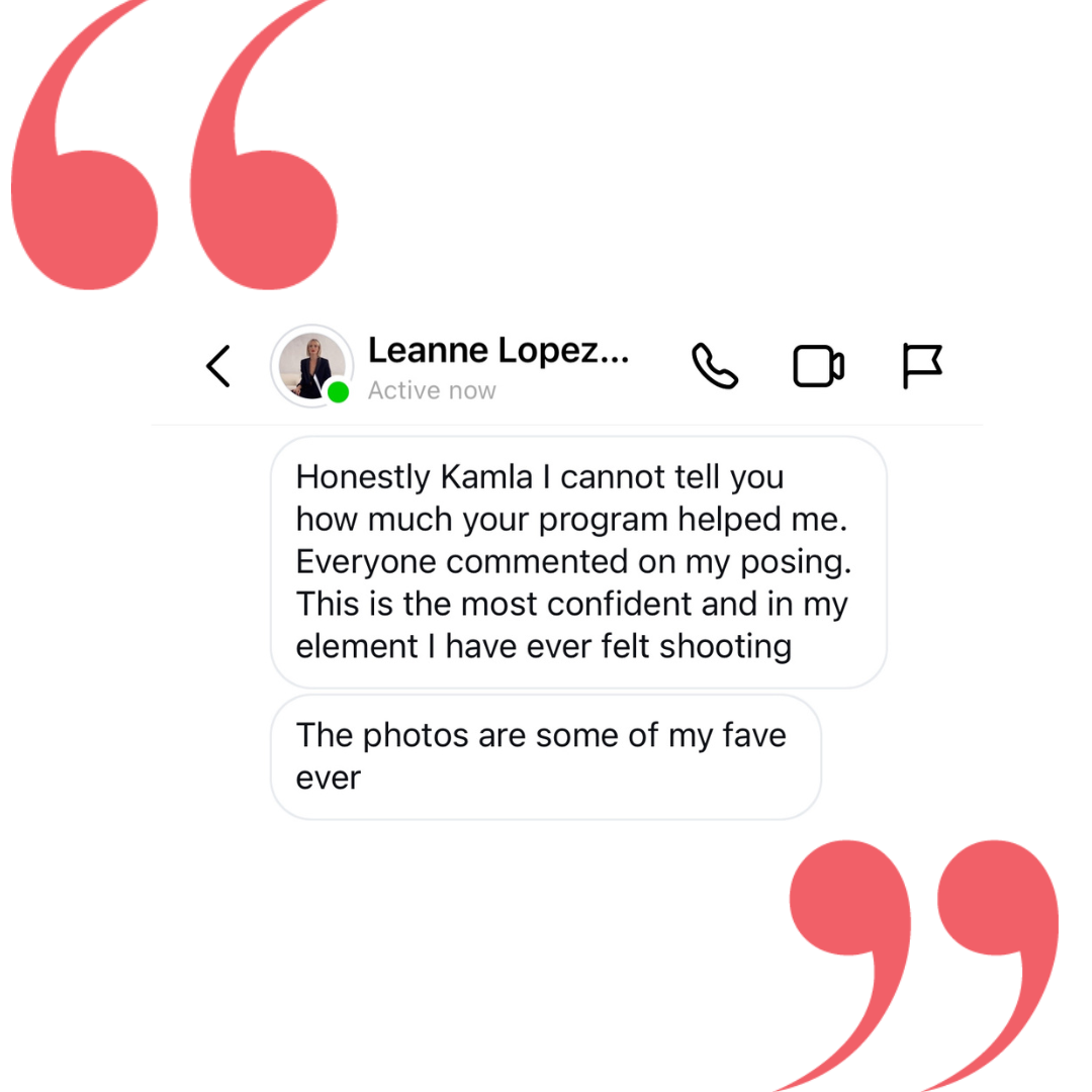 "The things you taught me to do with my face were actually one of the biggest parts, the most important part, because your face is the first thing people look at the most/first when they see a picture of you. Your course changed the way that I look at myself in photos. You all need Kamla-Kay’s program. Anyone doing branding shoots, please take her program. It will be the best money you have ever spent. We are going to Italy next month…and I said I’m going to re-watch Kamla’s program before I go because if I don’t have a photographer to guide me or if I need to direct my husband, I need to be able to give [my husband] cues.”"- Leanne
