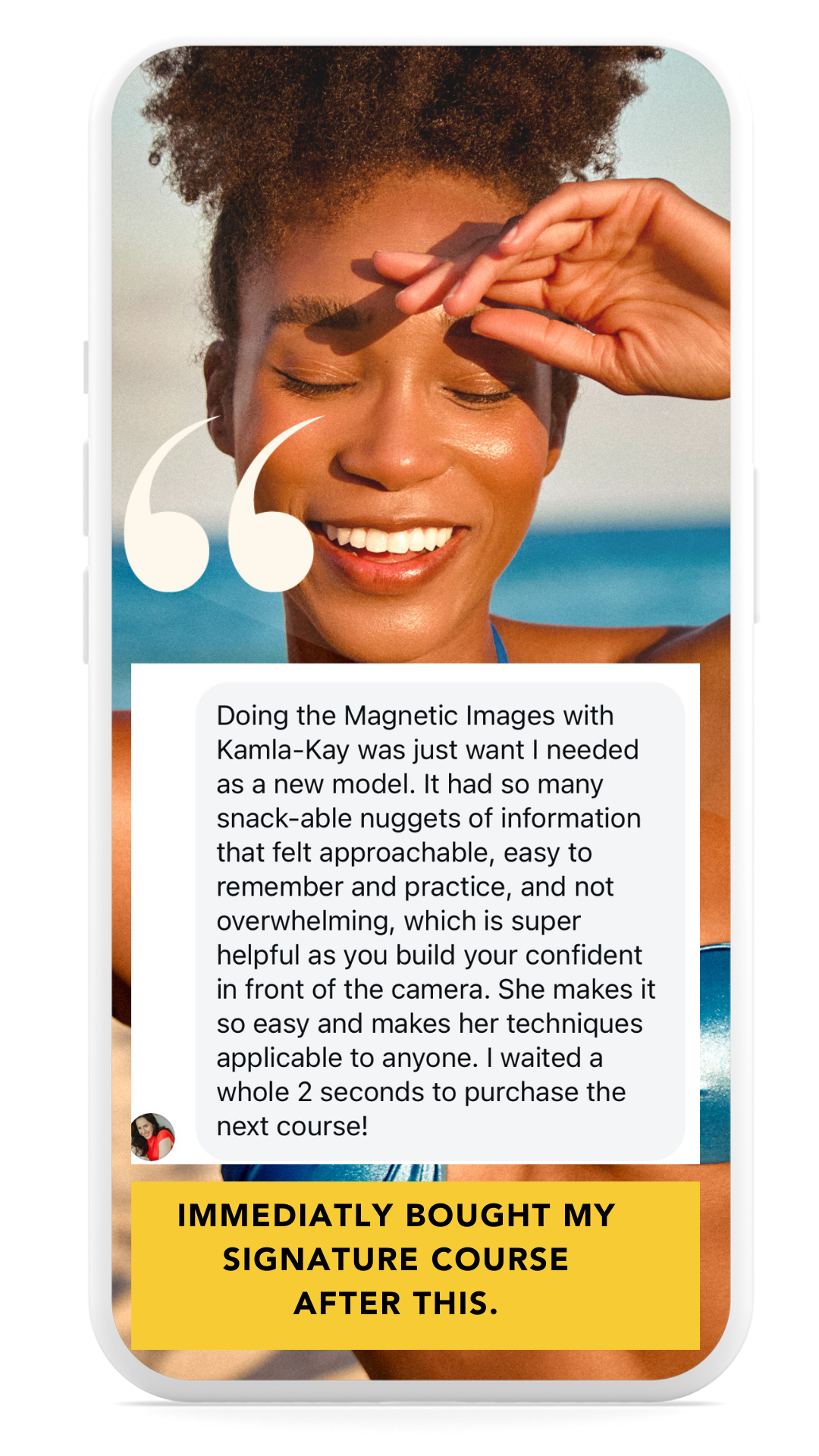"It was perfect timing...I had a photoshoot today and I implemented several of Kamla-Kay's techniques that I learned in the posing course and the photographer was highly impressed. I'm witnessing a whole new level of mastery [on-camera] unfold." - Joi
